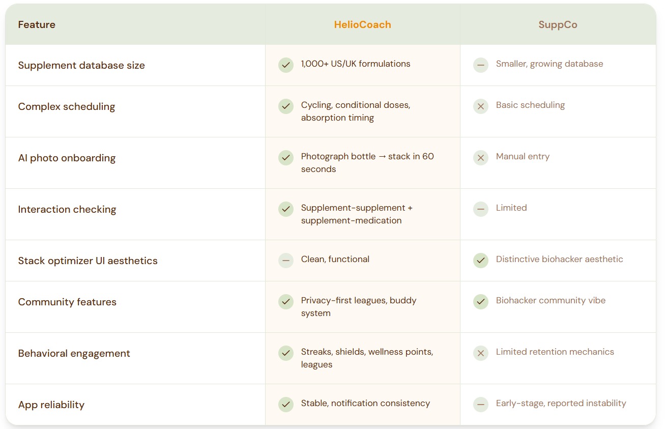 SuppCo’s positioning is correct: the supplement tracking category needed an app that thought about stacks, timing, and biohacker-level complexity rather than just medication reminders. If community aesthetics and stack optimizer UI are priorities for you, SuppCo’s design sensibility is distinct and has genuine appeal. However, for users who need reliable complex scheduling, a comprehensive supplement database, notification consistency, and behavioral engagement mechanics that support long-term adherence, HelioCoach delivers more of what supplement users actually need in daily practice. The gap is not vision — it is execution depth and reliability.