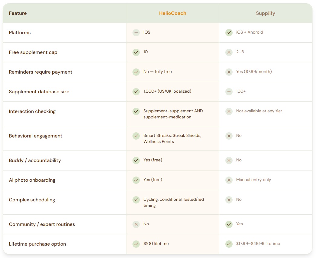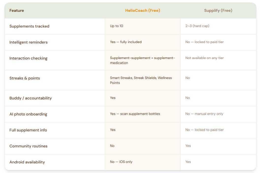 Supplify and HelioCoach are both free to download, but they serve different users. Supplify is a capable tracker for casual users who track 2–3 supplements and want a simple interface — it is genuinely well-designed. HelioCoach is built for users managing 5 or more supplements who need reminders, interaction checking, and behavioral tools without paying a monthly fee. HelioCoach is iOS only; Supplify is available on iOS and Android.