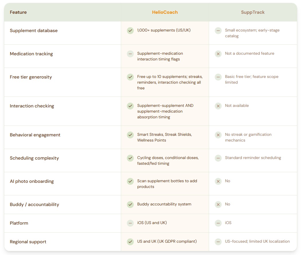 SuppTrack's existence alongside HelioCoach confirms that the supplement-first category has real demand beyond medication-adjacent apps — which benefits everyone building in the space.